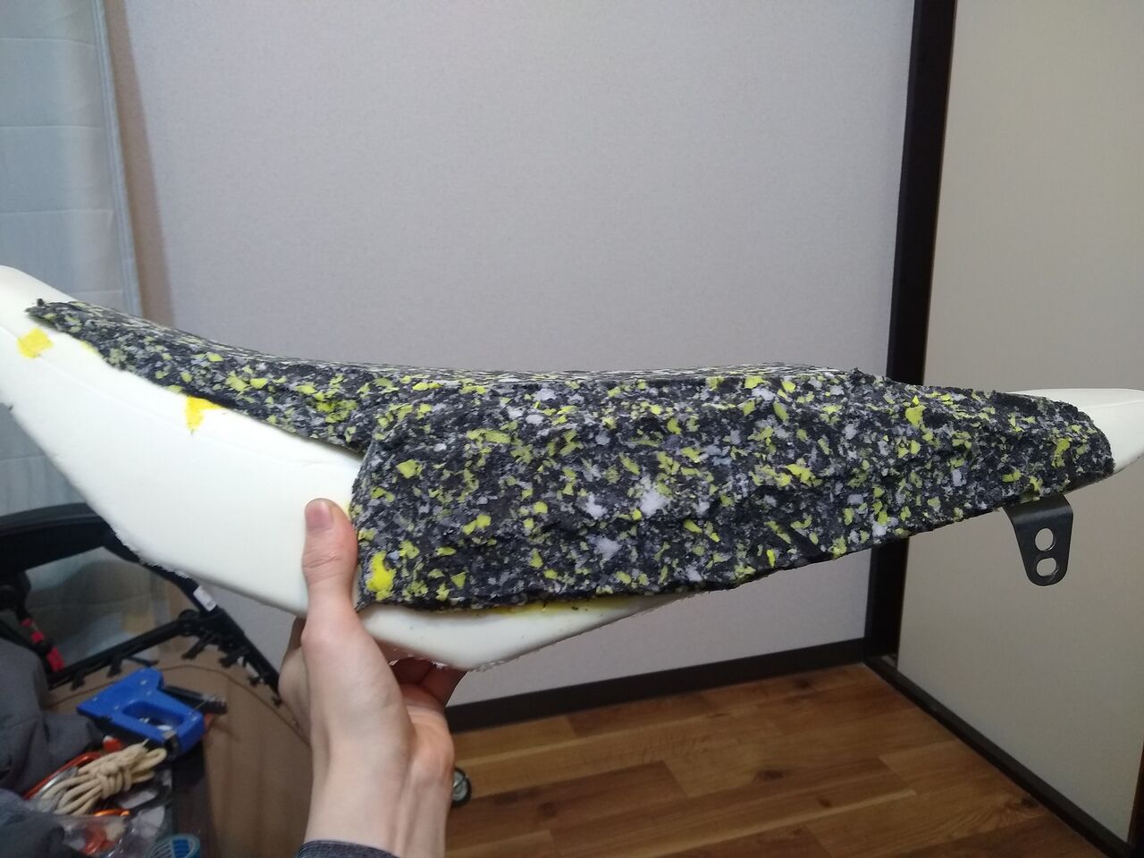 んで、オフロードバイクの乗車姿勢ではなく、少しお尻を後ろに持って行ってリラックスして乗る時の部分を幅+3cmにする為、サイドにこんな感じで接着しました(3cm厚を根気で半分にスライスして両面からG17で接着)