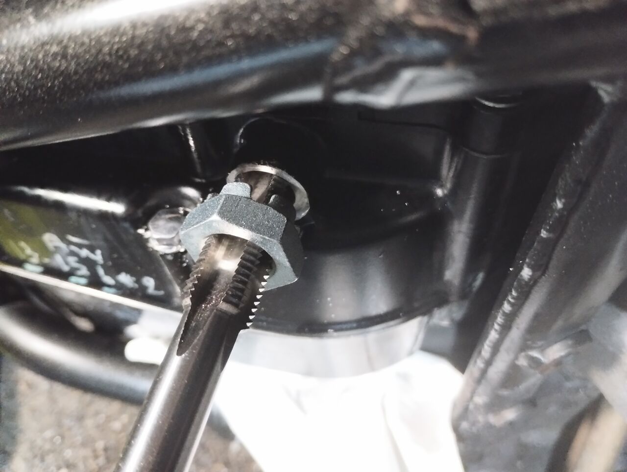 てなわけで、車のタイロッドエンドとかに使われるちょっと変わったロックナット(先が割れてて、割りピンをさして仮にネジ舐めても抜け防止として使われる)を使って簡易的タップガイドに。
