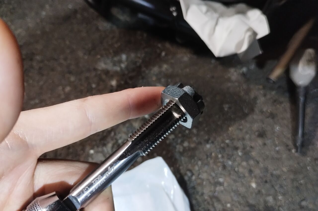 オイルパンの付いてない、クランクケースからダイレクトにオイル排出するタイプのリタップに加えて、斜め下方向からのタップ処理、さらにタップを新設するから穴に対して絶対垂直じゃないと座面とボルトの頭が斜めって結局オイル漏れを起こすから、、、ってクソめんどくせぇ状況でなんとか!なんとか直した!
