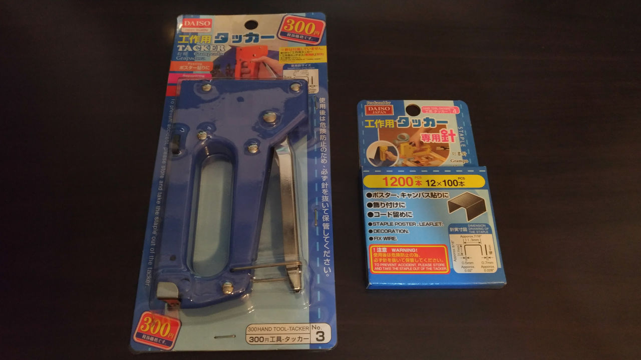 100均に売っていたタッカー(300円だけども)で代用できそうなのでこれに。ちなみに針はシートの張替えには使えなかった(上手く刺さらない・途中で折れる・時折出てこない)