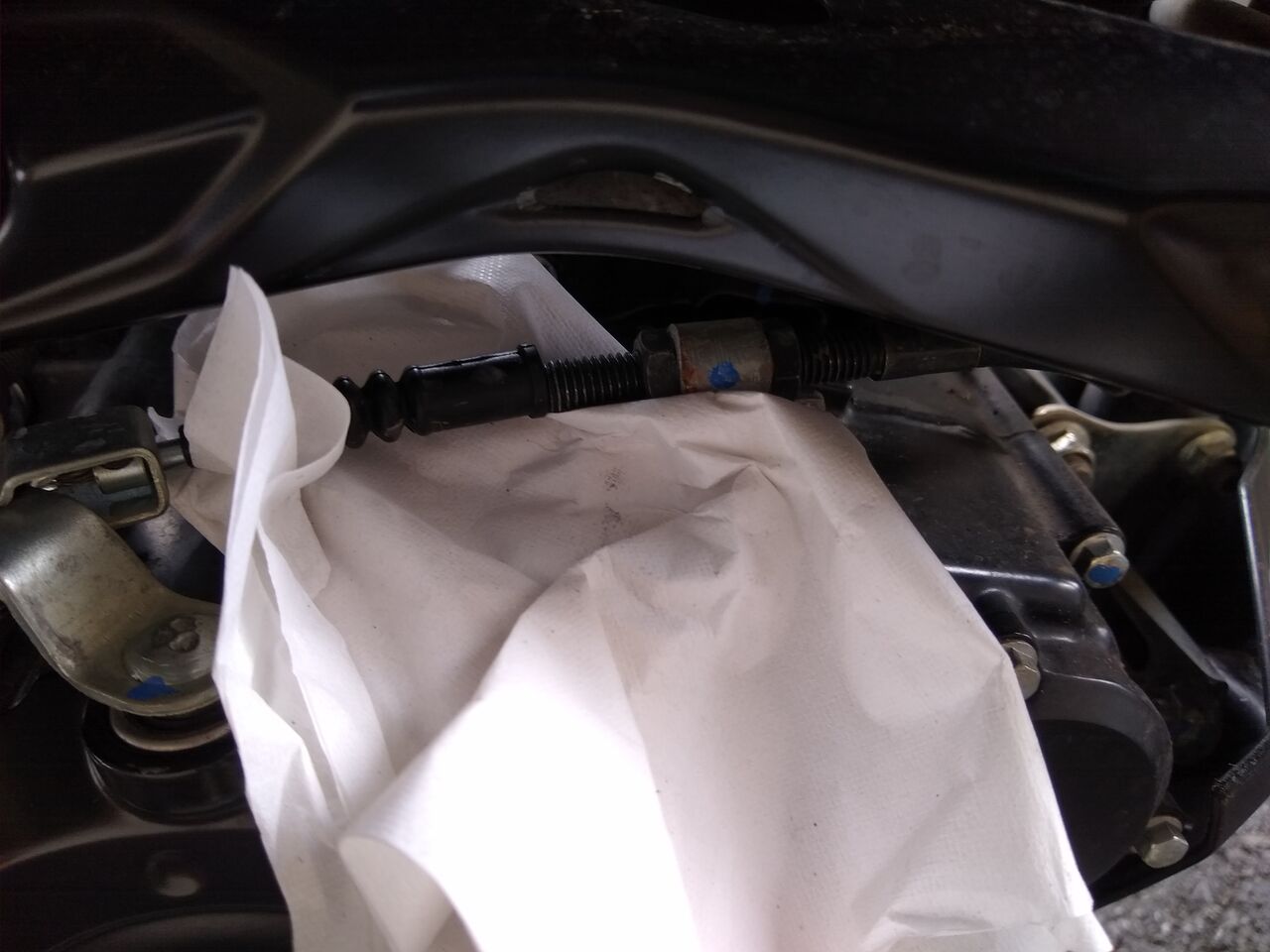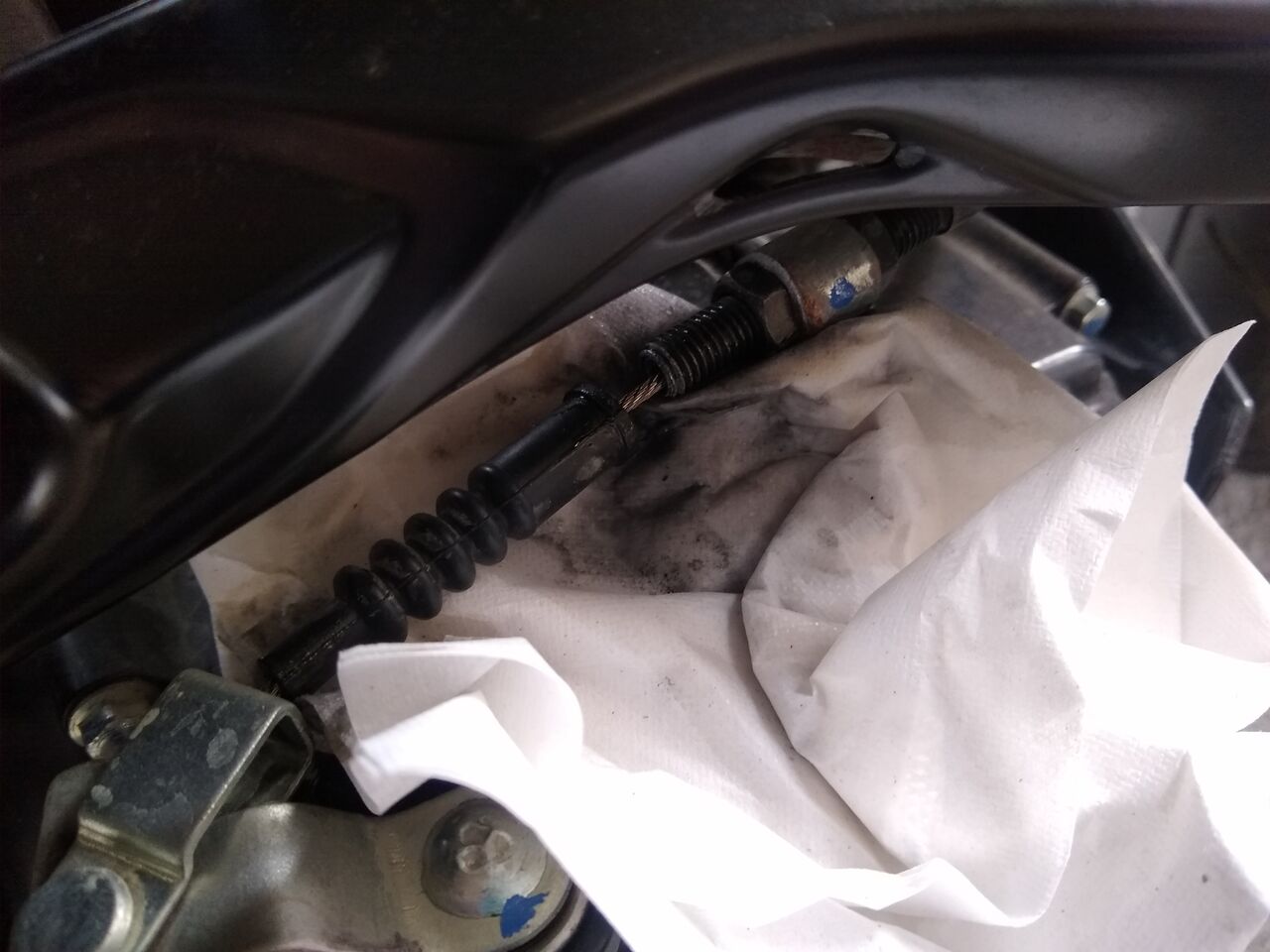 クラッチのレリーズ部分に繋がっているアウターホースのエンドら辺にパーツクリーナー 吸い取り用の紙を敷いておく。