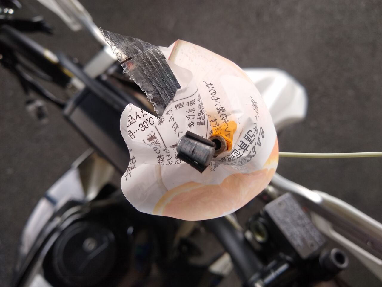 まずはワイヤー本体とワイヤーホース内に溜まった汚れを吐き出すためにクラッチレバーからワイヤーを取り外して、適度に硬さのある袋の端っこを切ってこんな風にアウターホースに巻きつけて花みたいにしておく。(適当なタイラップで固定しといた)