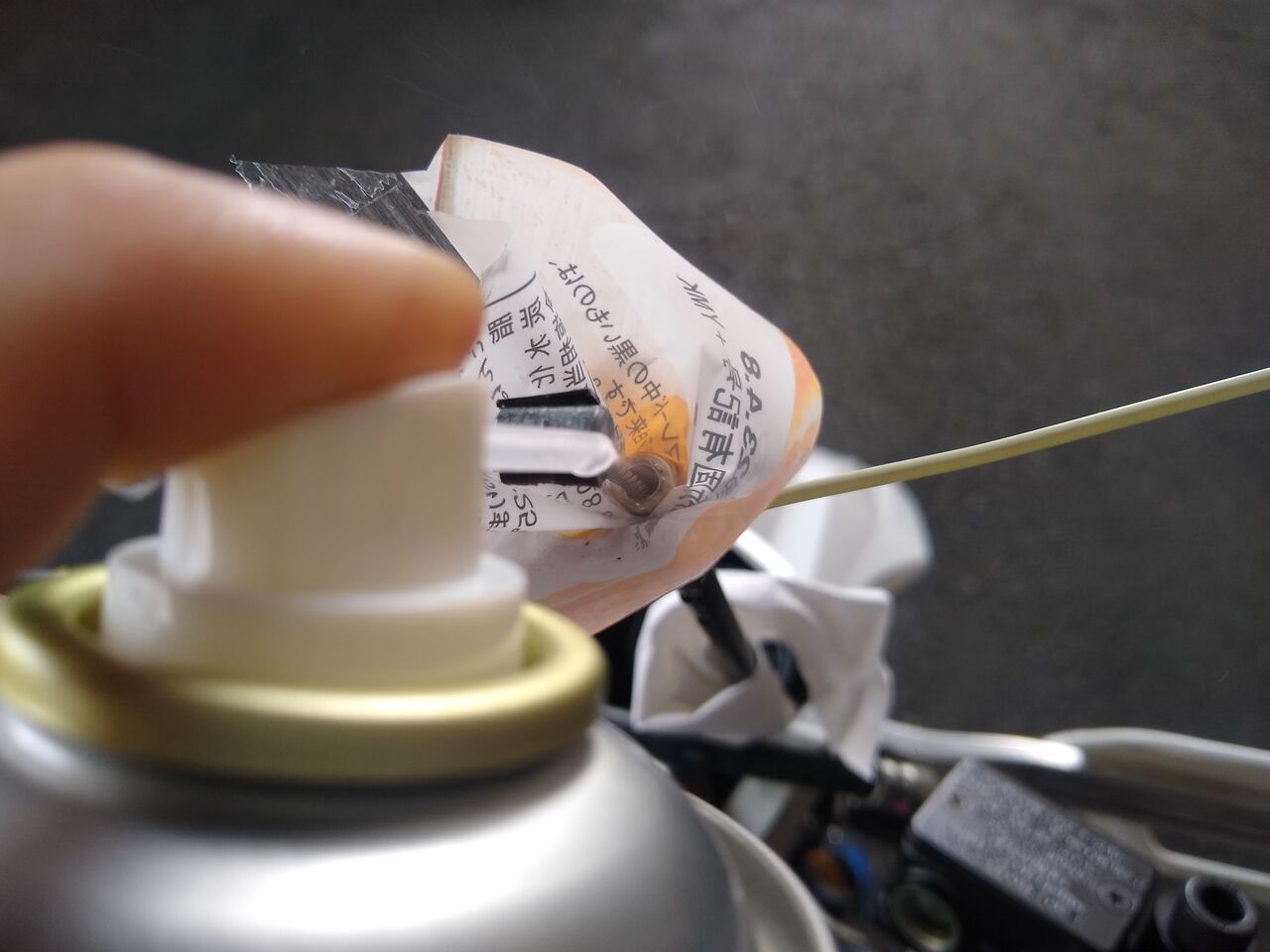 ワイヤー部分のメンテしても変わらず重たくて悲しいなぁなんて思ってたけど、そもそもレリーズの動作が渋い気がしたから試しにシールを痛めないチェーンルブ吹いてみたのね。