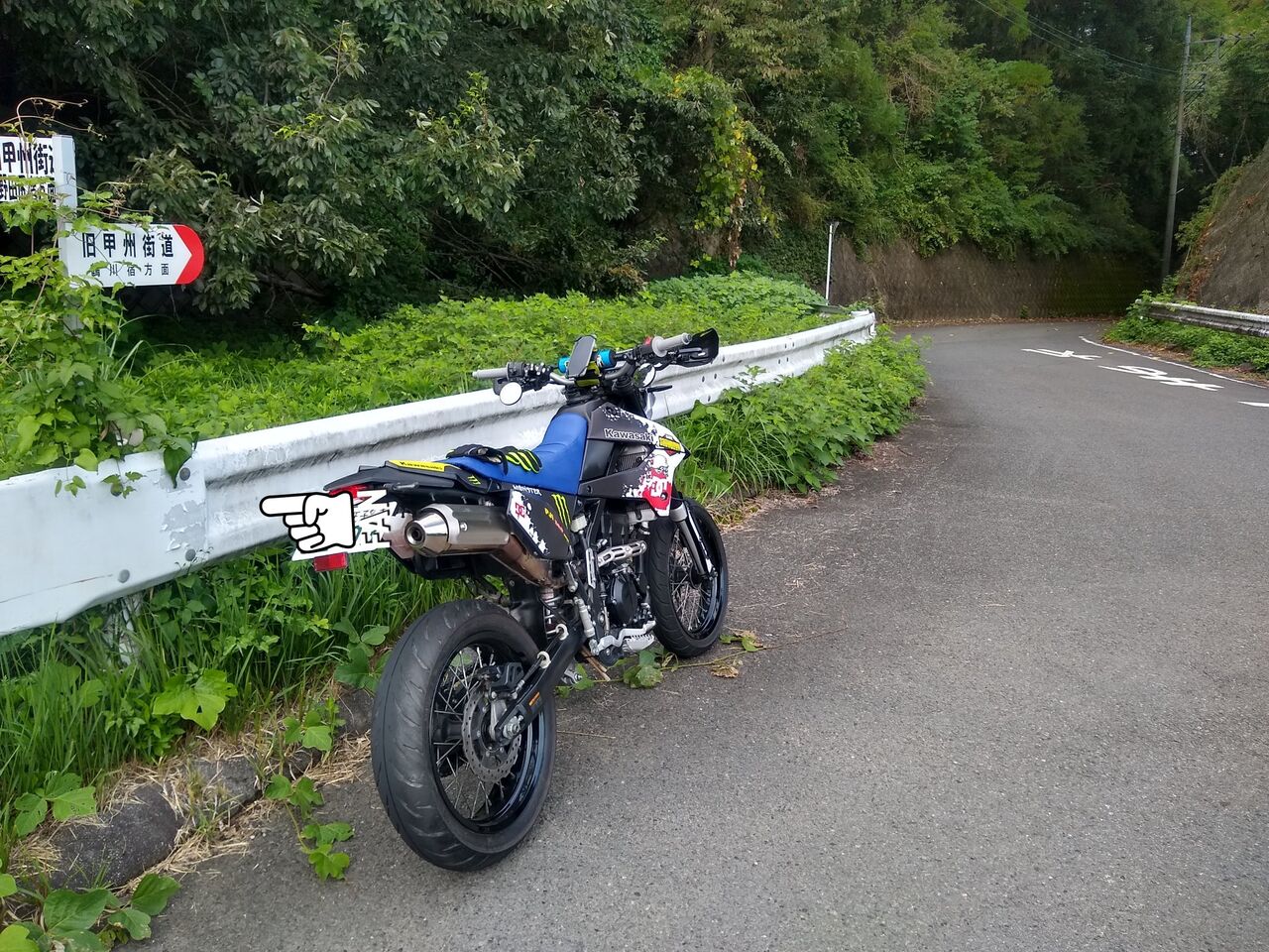 猿ヶ島行った後高圧洗浄機かけたら、赤色のKawasakiロゴがぶっ飛んでしまったから「こうなりゃ自分の好きな色にしたろw」って事で、フォークガード を水色にしたり、シートカバーを深い青にしたりお得意のチグハグにw