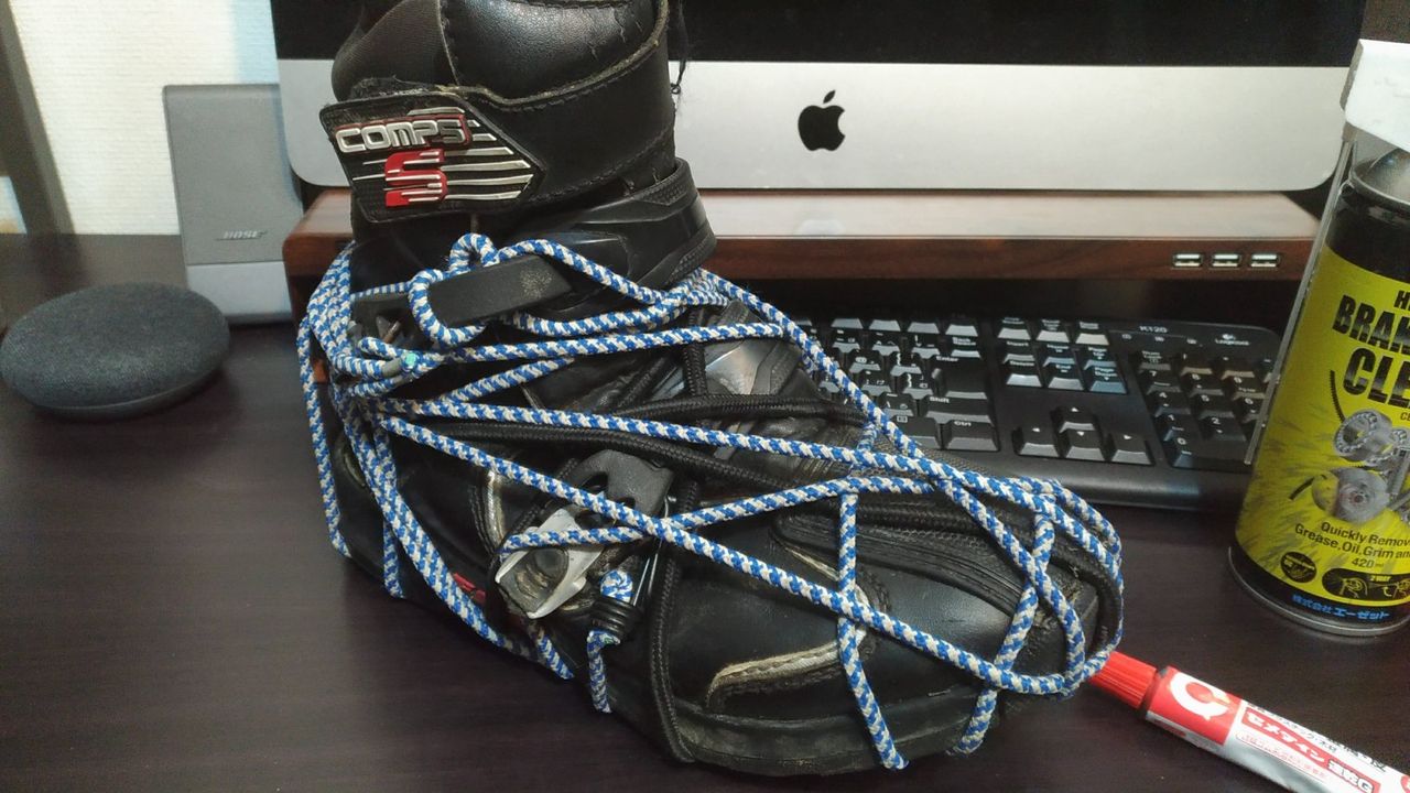 バイスや万力と言った挟む大きな工具は持っていないので、今回は自転車の荷台に括り付ける用のロープを使って縛ります٩( 'ω' )و