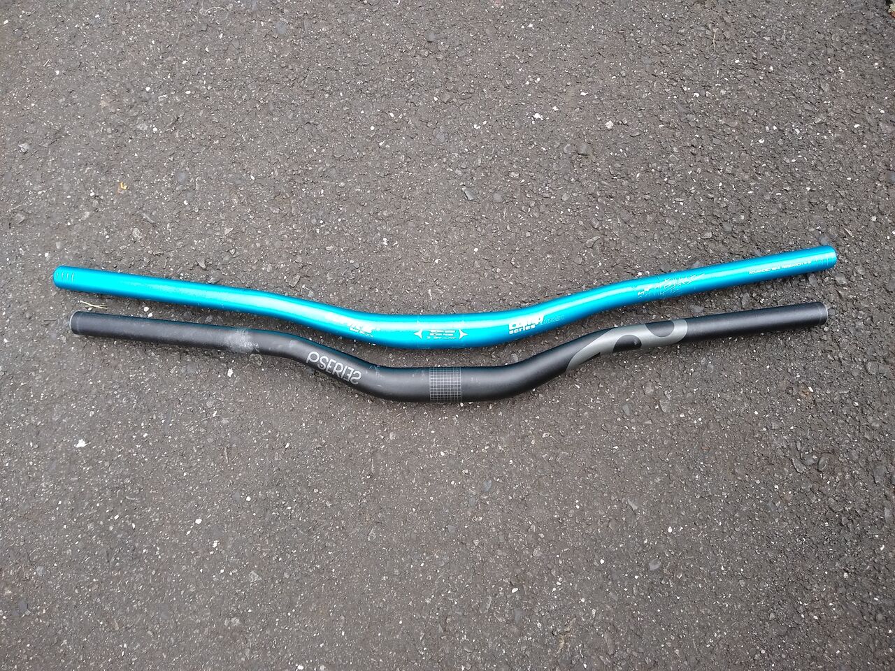 カットした純正ハンドルバーと以前購入した720mmのアルミハンドルバーを並べました。